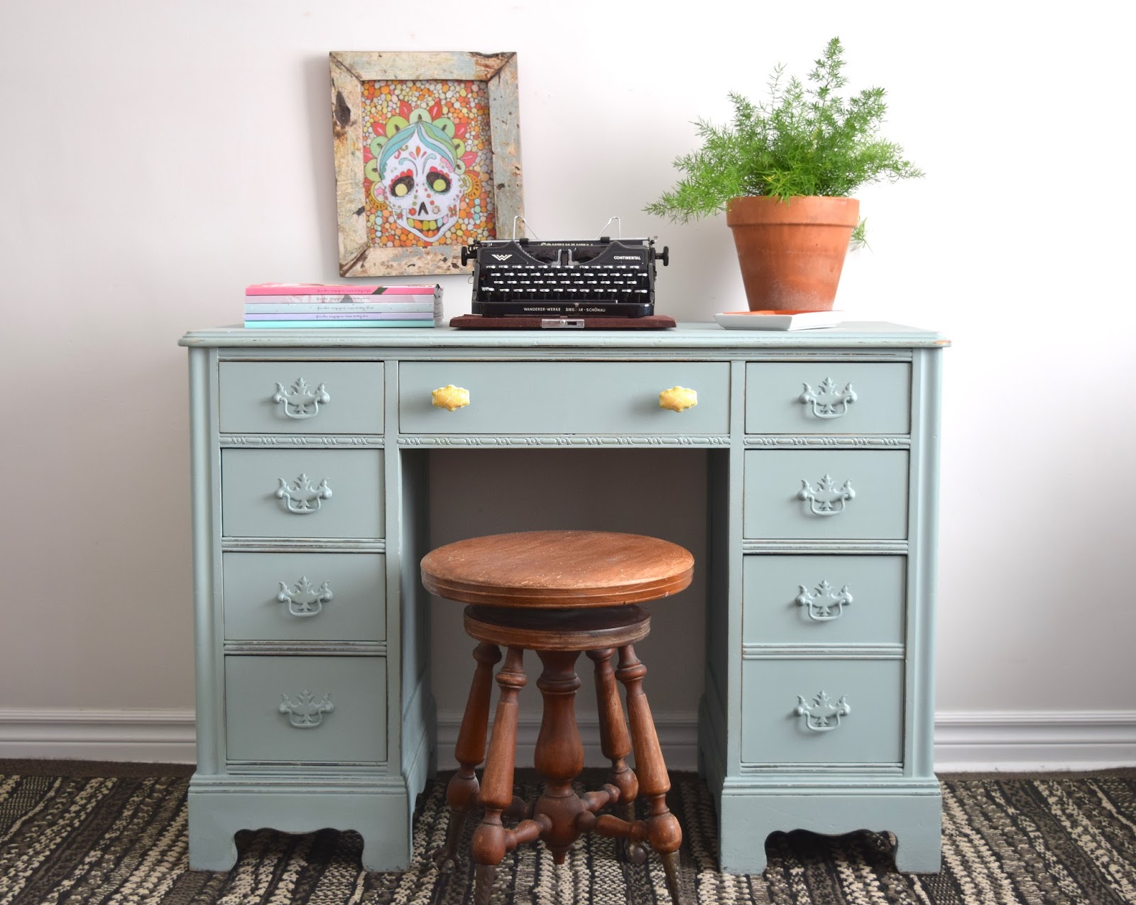 I haven't had a desk in stock for a while, so when this one came along I had to scoop it up. I opted to paint it in a pale blue-is -grey colour to appeal to those who love colour as well as to the customers that prefer neutrals. Drawers are all lined with retro wallpaper and the only pop of brightness are the two yellow and teal pulls in the centre.
